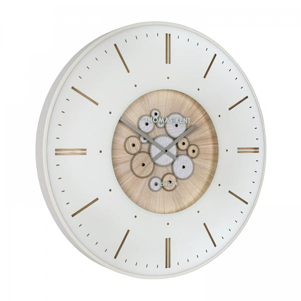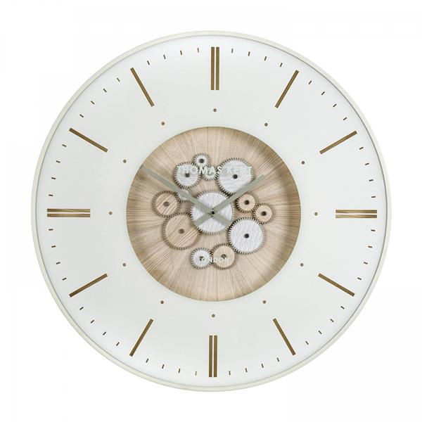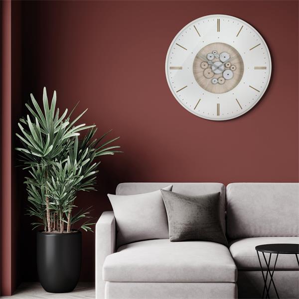 An assortment of decorative cogs move seamlessly together to create a dramatic exposed mechanical effect. Contemporarily designed, a contrasting wave and wood effect bring the wheels to life. Arranged on a 30", oak effect dial, an ivory metal frame encases the feature wall statement. The modern numerals reveal the wood effect, creating a natural appeal.