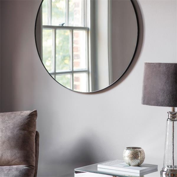 Featuring a slim elegant black metal frame, this round mirror is the perfect way to update your home. The contemporary shape and industrial inspired frame create a stunning statement piece.