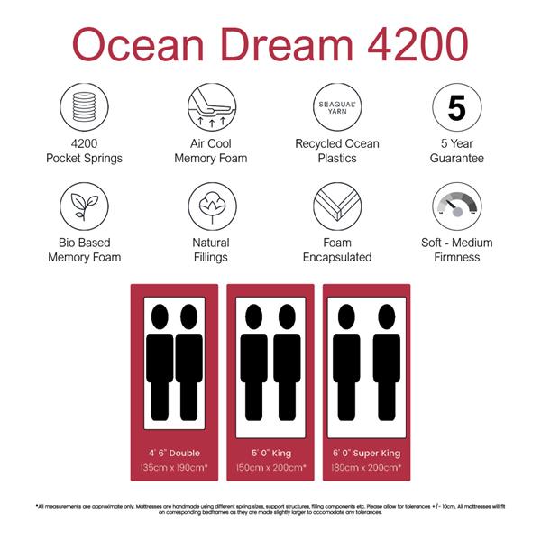 The Ocean Dream 4200 features a 10-turn pocket sprung system, designed to offer enhanced support and comfort. The individually wrapped springs move independently, adapting to the shape of your body and ensuring consistent, personalized support throughout the night.